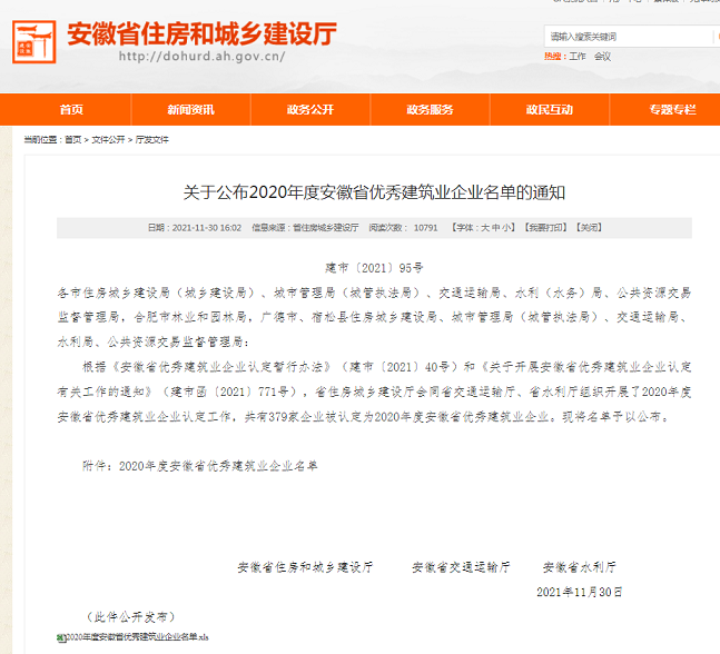 據(jù)悉,本次評(píng)優(yōu)是由安徽省住房和城鄉(xiāng)建設(shè)廳、省交通運(yùn)輸廳、省水利廳首次聯(lián)合開展的全省優(yōu)秀建筑業(yè)企業(yè)認(rèn)定評(píng)選活動(dòng),安徽省優(yōu)秀建筑業(yè)企業(yè)稱號(hào)是對(duì)我省建筑業(yè)企業(yè)綜合實(shí)力的認(rèn)定。