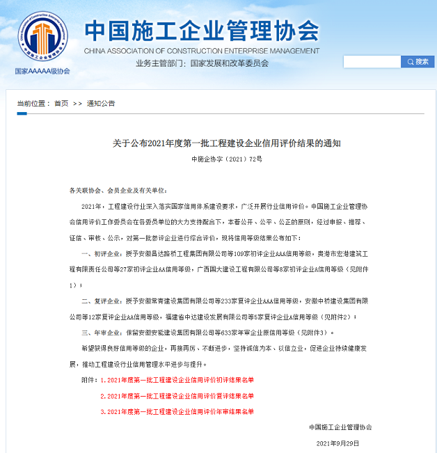 近日,在中國(guó)施工企業(yè)管理協(xié)會(huì)召開的2021年度工程建設(shè)誠(chéng)信企業(yè)推介大會(huì)上,公司再次獲得 “2021年度工程建設(shè)AAA信用等級(jí)企業(yè)”和“2021年工程信用7星級(jí)企業(yè)”等共二項(xiàng)榮譽(yù),這也是“十四五”開局之年公司全面貫徹新發(fā)展理念、構(gòu)建信用新發(fā)展格局在行業(yè)信用體系建設(shè)方面取得的突出成效。2021年,公司不斷完善信用體系,強(qiáng)化信用導(dǎo)向,企業(yè)管理水平和社會(huì)信譽(yù)度不斷提升。今后公司將以此為契機(jī),不斷總結(jié)經(jīng)驗(yàn),補(bǔ)齊發(fā)展短板,助力企業(yè)高質(zhì)量發(fā)展。