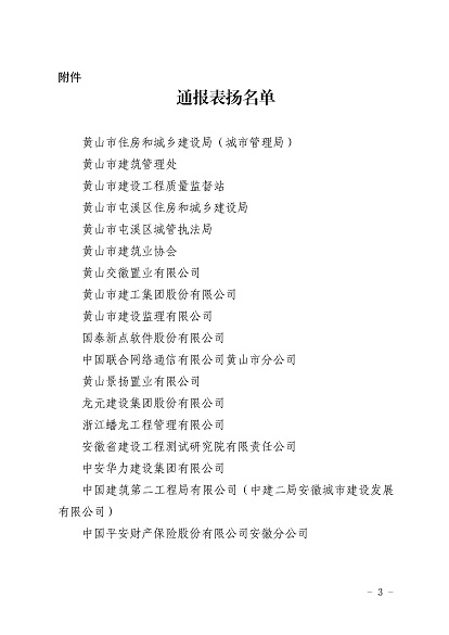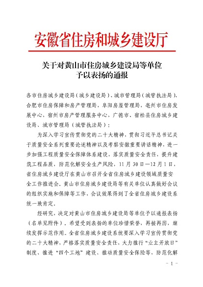 近日,安徽省住房和城鄉(xiāng)建設(shè)廳印發(fā)《關(guān)于對黃山市住房和城鄉(xiāng)建設(shè)局等單位予以表揚(yáng)的通報》,《通報》指出,11月30日-12月1日,省住房和城鄉(xiāng)建設(shè)廳在黃山市召開全省住房建設(shè)領(lǐng)域質(zhì)量安全工作推進(jìn)會,會議效果得到全省住房城鄉(xiāng)建設(shè)系統(tǒng)一致肯定,并對在此次會議認(rèn)真做好組織實(shí)施和保障的單位予以通報表揚(yáng),黃山市建工集團(tuán)股份有限公司作為唯一一家本土建筑施工企業(yè)榮獲表揚(yáng)。