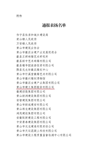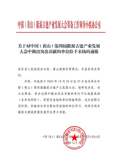 市委、市政府于2024年10月24日至25日成功舉辦中國(guó)(黃山)第四屆徽派古建產(chǎn)業(yè)發(fā)展大會(huì)。近日,中國(guó)(黃山)徽派古建產(chǎn)業(yè)發(fā)展大會(huì)籌備工作領(lǐng)導(dǎo)小組辦公室發(fā)布《關(guān)于對(duì)中國(guó)(黃山)第四屆徽派古建產(chǎn)業(yè)發(fā)展大會(huì)中做出突出貢獻(xiàn)的單位給予表?yè)P(yáng)的通報(bào)》,黃山建工集團(tuán)榮列其中。