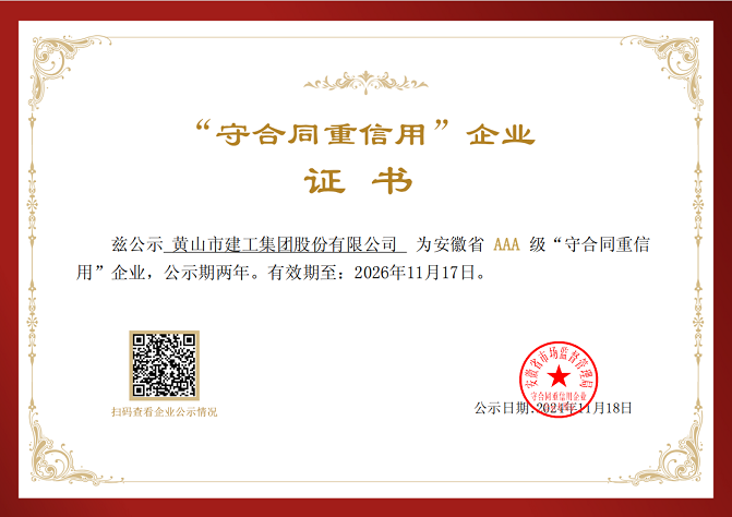 近日,黃山建工集團(tuán)憑借健全的信用管理體系、優(yōu)良的合同履約信用狀況和良好的市場信譽(yù)榮獲安徽省AAA級(jí)“守合同重信用”企業(yè)稱號(hào)。這一榮譽(yù)的獲得,不僅是對黃山建工集團(tuán)在企業(yè)經(jīng)營過程中始終堅(jiān)持誠信經(jīng)營的肯定,也是對黃山建工集團(tuán)在合同履行和信用管理方面所取得的顯著成績的認(rèn)可。